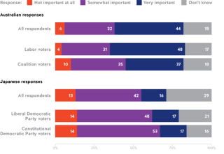 - And Australians and Japanese publics want to be able to operate independently — 76 per cent of Australians and 58 per cent of Japanese respondents say developing a foreign policy that was independent of global powers was somewhat to very important.