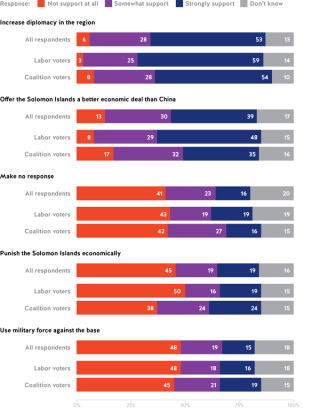 - Should China end up building a military base in the Solomon Islands, majorities of US, Australian and Japanese respondents prefer a positive approach with increased diplomacy in the region and offering the Solomon Islands a better economic deal than China rather than punishing the Solomon Islands economically or using military force against the base.